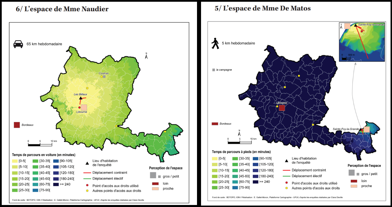 La force du livre repose sur le choix d’une enquête monographique, réalisée de 2014 à 2017 au sein du pays du Libournais, à la fois un pays administratif [4] et un territoire rural principalement viticole situé au nord-est de Bordeaux. Le livre est organisé en quatre parties. Les deux premières montrent que les réformes de dématérialisation se préoccupent moins du problème de l’accès que « du fonctionnement et de l’image des institutions en charge de la production de ce droit » (p. 61). Les deux suivantes traitent des parcours d’accès au RSA d’ayants droit, soulignant comment leurs situations résidentielles et leurs localisations affectent leurs capacités à se saisir des démarches administratives [5]. Deville propose en annexe des « cartes mentales » (p. 52, voir figure 1), c’est-à-dire des cartes du Libournais permettant de visualiser la capacité de déplacement des enquêtés à la fois objective (voiture, vélo) et subjective (sentiment de distance vis-à-vis des grandes villes). La sociologue navigue donc entre plusieurs niveaux : construction du territoire par les institutions administratives (comme les Caisses d’allocations familiales), analyse des parcours individuels d’accès au RSA et observation des échanges entre guichetiers et enquêtés issus de différents milieux sociaux. Cette navigation d’une échelle d’analyse (Sawicki 2000) à l’autre s’accompagne de changements d’outils méthodologiques qui font la richesse ethnographique de l’ouvrage : croquis des habitations, travail d’archive, cartes mentales, entretiens semi-directifs, observation participante, accompagnement dans les démarches administratives, etc. La chercheuse déplace ainsi le regard vers des lieux peu étudiés de la production du droit, décrivant par exemple l’entraide entre membres d’une chorale pour réaliser leurs démarches.