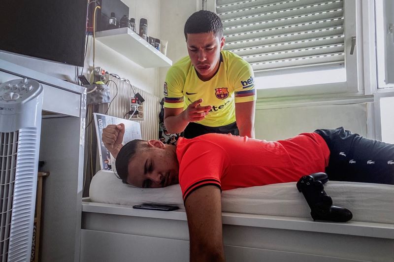 © Tassiana Aittahar. Cette photographie reprend une scène de début de La Haine, lorsque Saïd vient réveiller Vinz dans sa chambre et débute un « pierre, feuille, ciseau ».