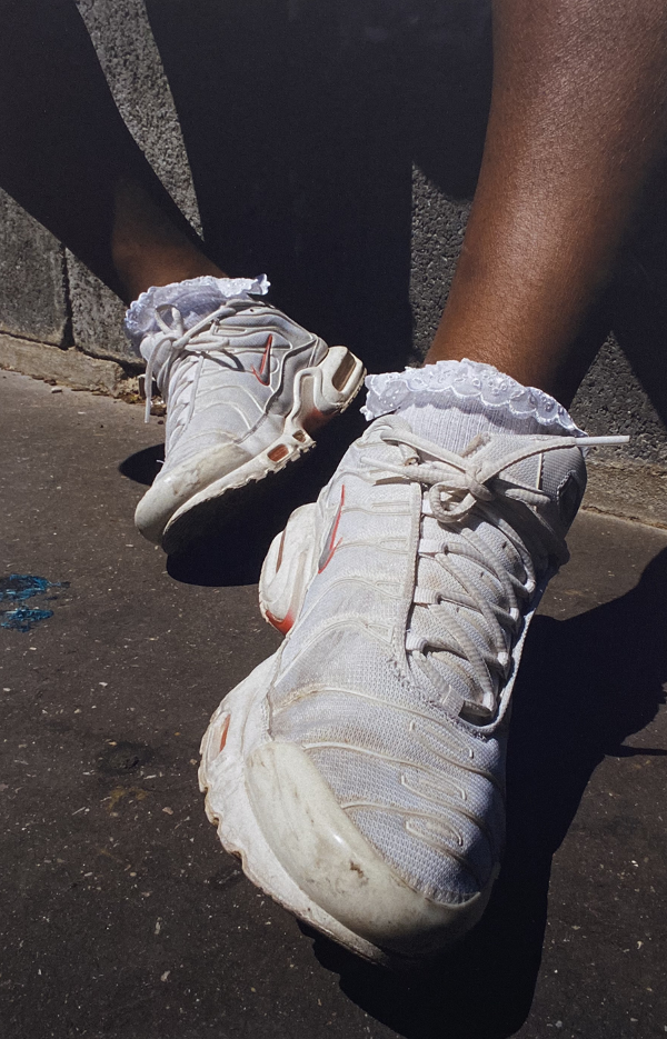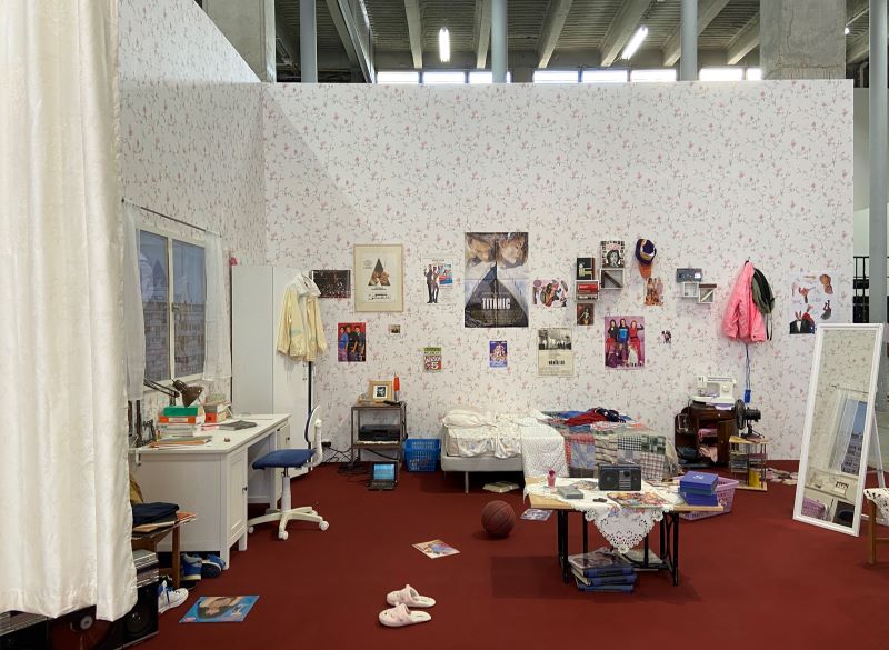 Un autre point commun entre les deux films reste la faible visibilité des femmes (Deville 2007), à laquelle peut d’ailleurs contribuer le cinéma. Les œuvres sont ainsi l’occasion de questionner la présence et le vécu féminin dans la cité, et de manière plus large les rapports sociaux de sexe qui y prennent place. Les photographies de Nouta Kiaïe interrogent ainsi les relations entre les filles et les garçons ainsi que la frontière entre les genres. La photographie ci-dessus (figure 4) évoque le style vestimentaire des filles à travers les Nike « TN », qui étaient quelques années plus tôt quasi exclusivement portées par les garçons dans les cités, dans un contexte où l’espace public est essentiellement masculin. Les photographies de Tassiana Aittahar témoignent de scènes du quotidien : dans l’une d’entre elles, un groupe de filles et de garçons partage un moment installé sur des chaises au pied d’un immeuble. Enfin, l’installation performée d’Émilie Pria, La Chambre de Sarah ou la chambre de la sœur de Vinz (figure 5), reconstitue une chambre d’adolescente pour donner vie à ce personnage, en associant de manière révélatrice féminité et espace privé du logement dans le contexte des cités.
