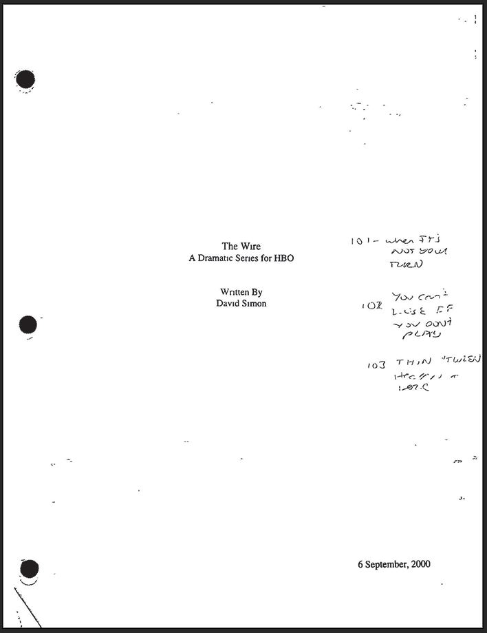 - Simon, D. 2000. The Wire, a dramatic series for HBO, manuscrit de la bible de la série The Wire, 6 septembre 2000.