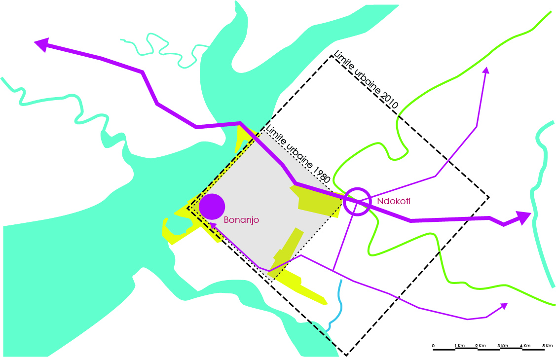 Cette réalité urbaine conflictuelle se cristallise dans des représentations antagonistes. Lors d’une séance d’échanges entre représentants de l’administration et professionnels [7] s’est ainsi jouée une dispute révélatrice entre la présidente du Syndicat des commerçants détaillants et le délégué du gouvernement. Douala, ville d’estuaire, s’est développée de façon unidirectionnelle : son centre de gravité a progressivement migré vers l’Est alors que la ville s’étendait (figure 3) et il correspond aujourd’hui au lieu-dit Ndokoti. Lieu d’échanges marchands et sociaux intenses, Ndokoti est aussi le point de passage unique pour contourner les grandes emprises logistiques et industrielles, si bien que la concurrence entre fonctions circulatoires et fonctions économiques y est particulièrement conflictuelle. Pour autant, les fonctions de pouvoir politique, administratif et économique ont toujours été maintenues dans le centre historique Bonanjo. À tel point qu’aujourd’hui, un des éléments clefs de la stratégie économique de la ville consiste à rénover ce quartier pour le transformer en vitrine d’un développement tertiaire annoncé sans évaluation réelle des contraintes foncières, fonctionnelles et patrimoniales du site, sans évaluation non plus du potentiel d’autres sites urbains. Si la présidente du Syndicat identifiait Ndokoti comme lieu de centralité de la ville, le délégué du gouvernement considérait Bonanjo comme centralité urbaine majeure. Ce vis-à-vis révélait les revendications propres de deux positions territoriales distinctes, mais rendait également compte de leur reconnaissance mutuelle. Ce qui s’est joué à ce moment était donc tout à fait inédit et prometteur quant à la capacité à penser l’organisation future de la ville dans l’articulation de représentations et aspirations plurielles.