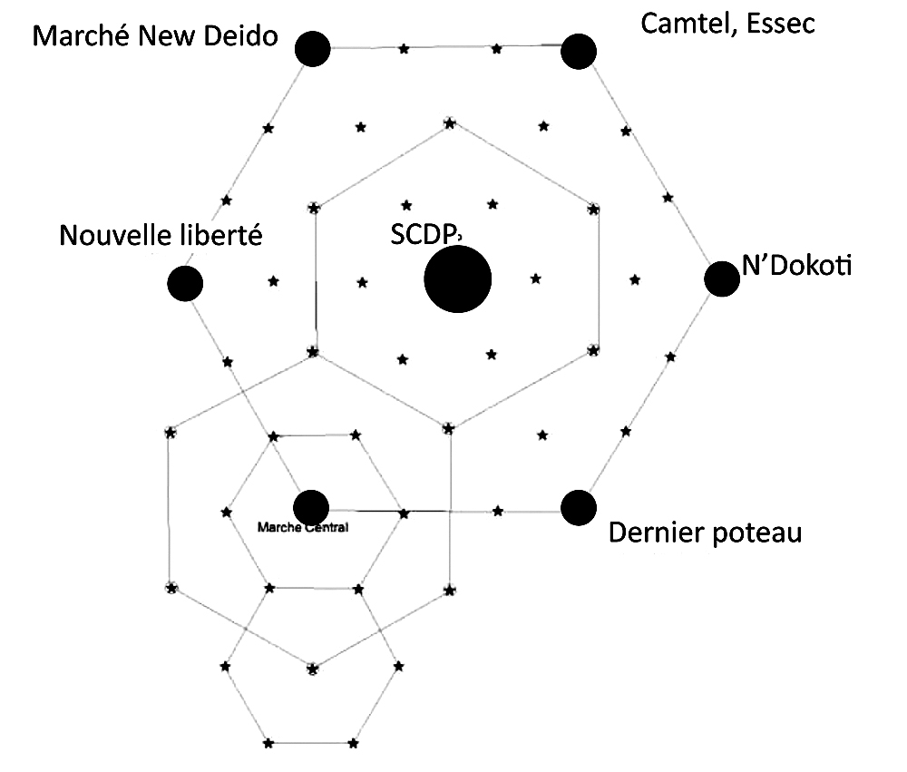 Il ressort également que les activités informelles ne se répartissent pas de façon aléatoire dans l’espace urbain mais dessinent au contraire un certain ordre. Une approche macro, à l’échelle de la ville, révèle des points d’intensité qui esquissent une hiérarchie des polarités urbaines différente de celle délivrée par les représentations usuelles de la ville. L’exemple des marchés a permis d’en faire la démonstration. Douala est pourvue d’un marché central, conçu dans les années 1970 et dimensionné pour une ville qui comptait alors 300 000 habitants. Depuis, aucun nouveau marché n’a été planifié par les autorités urbaines alors que la ville a gagné plus de deux millions d’habitants. Limité en taille et en accessibilité, le marché central n’est plus en mesure de répondre aux besoins nouveaux d’une ville devenue millionnaire. Des marchés informels se sont de fait développés spontanément, puis ont été plus ou moins arrangés pour en améliorer le fonctionnement. [5] Ces nouveaux marchés, localisés en étoile autour du marché central, dessinent un système marchand ordonné (figure 2). Ce système est fortement articulé au système de transports en commun, lui-même principalement assuré par le secteur informel. [6]