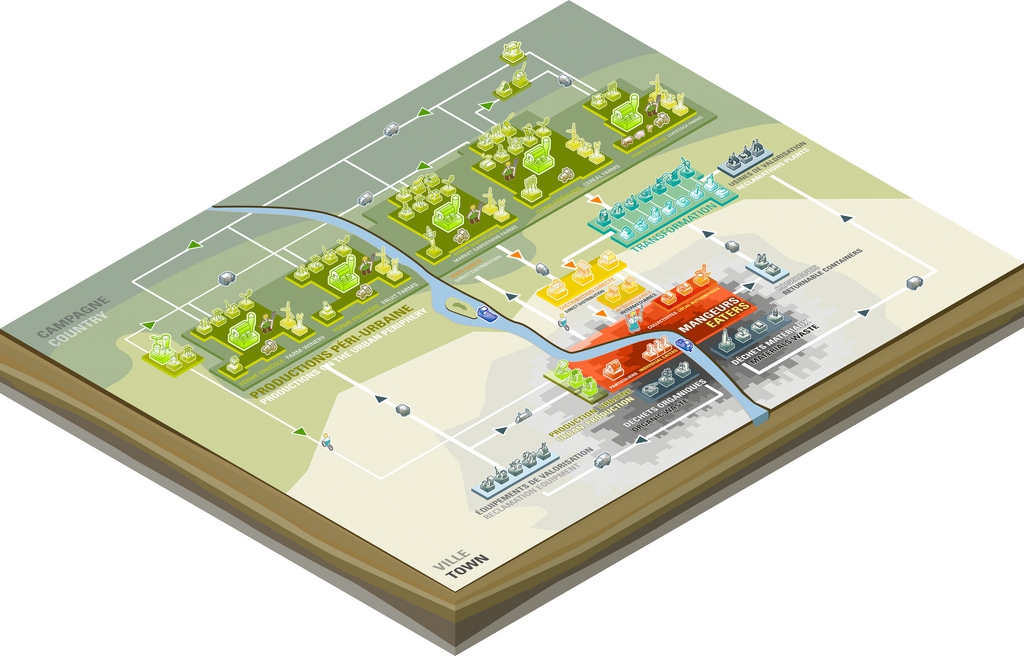 Lancé par deux designers indépendants fondateurs de l’agence Faltazi, le projet des Ekovores propose, au-delà d’une approche territoriale multiscalaire et systémique en circuit (voir schéma 2), une mise en œuvre opérationnelle à travers la création d’équipements originaux et de nouveaux métiers dédiés à l’agriculture urbaine. Ces réflexions valorisant une économie agricole circulaire et métropolitaine apparaissent comme un exemple-type du foisonnement d’acteurs et d’échelles. Mais bien que l’idée séduise, la mise en œuvre et le développement de projets d’agriculture urbaine sont freinés par un manque criant d’opérationnalité. Le cadre normatif lui-même est flou et inadapté. Il ne parvient pas à fédérer et coordonner des projets traditionnels, impliquant maîtrise d’ouvrage et maîtrise d’œuvre, des démarches institutionnelles descendantes, proches de la planification territoriale, ou d’institutionnalisations ascendantes [3].