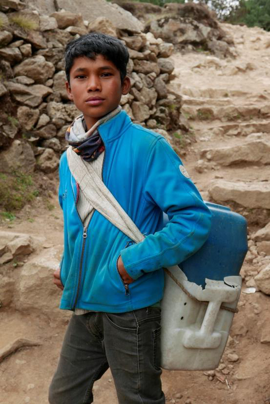 Malgré la difficulté de son travail de porteur d’eau, Maïla est heureux d’être nourri et logé et de vivre près des yaks. Il effectue en moyenne quatre trajets par jour pour répondre aux besoins journaliers des animaux qui boivent entre 40 et 60 litres d’eau, sans compter les besoins des employés gouvernementaux. Âgé de 13 ans et originaire du district de Nuwakot, Maïla a trouvé du travail dans la région touristique de l’Everest grâce à un cousin guide et peut ainsi soutenir sa famille, dont la maison a été détruite par le séisme dévastateur du 25 avril 2015.