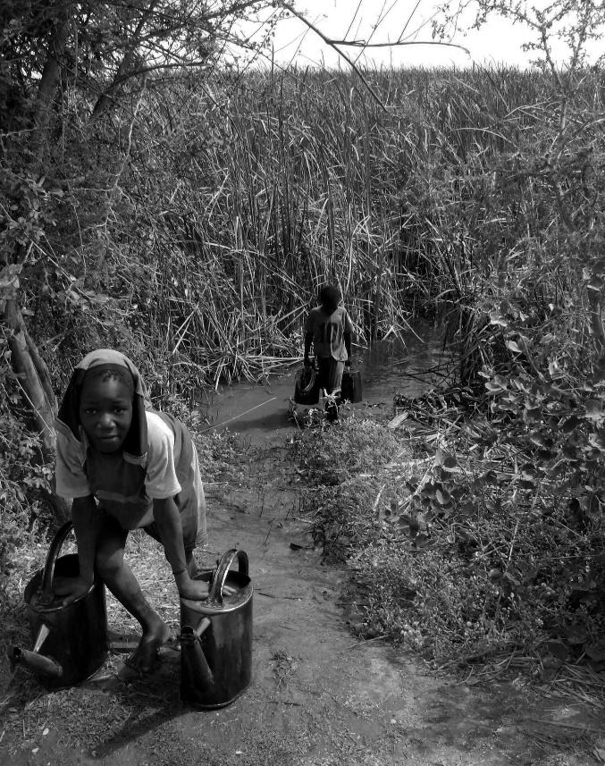 Sur cette photo, deux enfants de la même famille remplissent des arrosoirs de plus de 10 litres chacun dans une zone de hautes herbes, inondée par le fleuve Niger, et située non loin du jardin maraîcher familial. L’enfant au premier plan profite de la pose devant l’appareil pour se soulager de sa charge d’eau trop lourde pour son âge. Avec son comparse, ils fournissent cet effort plusieurs fois par jour.
