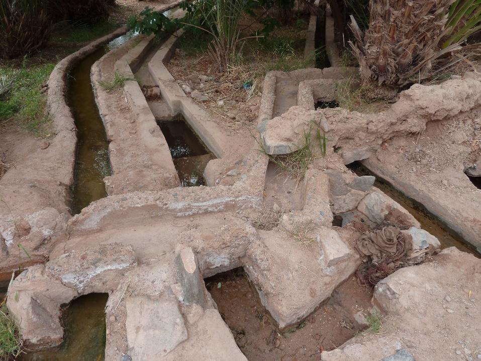 Chaque foggara alimente une succession de canaux (les seguias), qui se divisent en formant un système hiérarchisé et ramifié de canaux de plus en plus étroits, desservant en bout de course chaque jardin de la palmeraie, par simple gravité. Le tracé des canaux est ainsi adapté à la topographie du terrain tout en intégrant une autre spécificité : la gestion de l’eau d’une seguia par un ksar, un lignage ou une famille, quel que soit l’éparpillement des jardins. Chaque groupe social a ainsi son propre réseau de seguias qui assure l’acheminement de ses parts d’eau vers ses jardins. Pour préserver cette gestion privée, il n’est pas rare de trouver de petits ponts qui permettent à deux tronçons du réseau de se croiser, sans mélanger leurs eaux. Ce système d’acheminement par gravité présente l’intérêt de ne pas nécessiter d’énergie pour transporter l’eau, ce qui est un élément important pour leur réhabilitation.