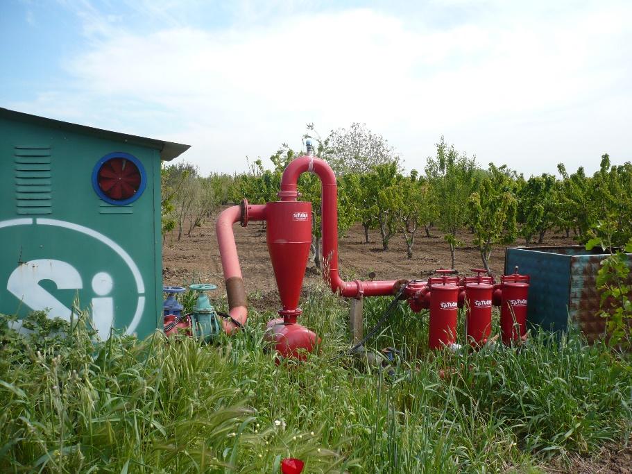 Cette photographie montre un forage de la coopérative d’irrigation d’Armutlu, associé à un hydrocyclone – dispositif de force centrifuge séparant les débris les plus gros de l’eau – et à des filtres à disques, pour éviter que le matériel de goutte à goutte des irrigants ne se bouche.