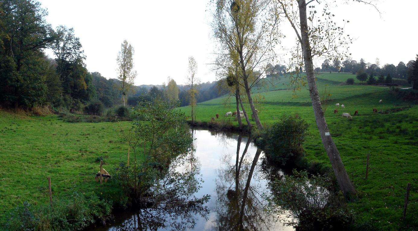 Cette photographie a été prise dans la vallée de l’Airou (affluent de la Sienne), dans le département de la Manche en Normandie. La rivière s’écoule au sein d’un paysage de bocage marqué par l’élevage bovin. Sur la rive à gauche du cours d’eau sur l’image, on distingue (en jaune et noir) une discrète pompe à nez (ou pompe de prairie) installée en bordure de la parcelle agricole. Deux clôtures installées le long des deux berges empêchent les bovins d’accéder à la rivière.