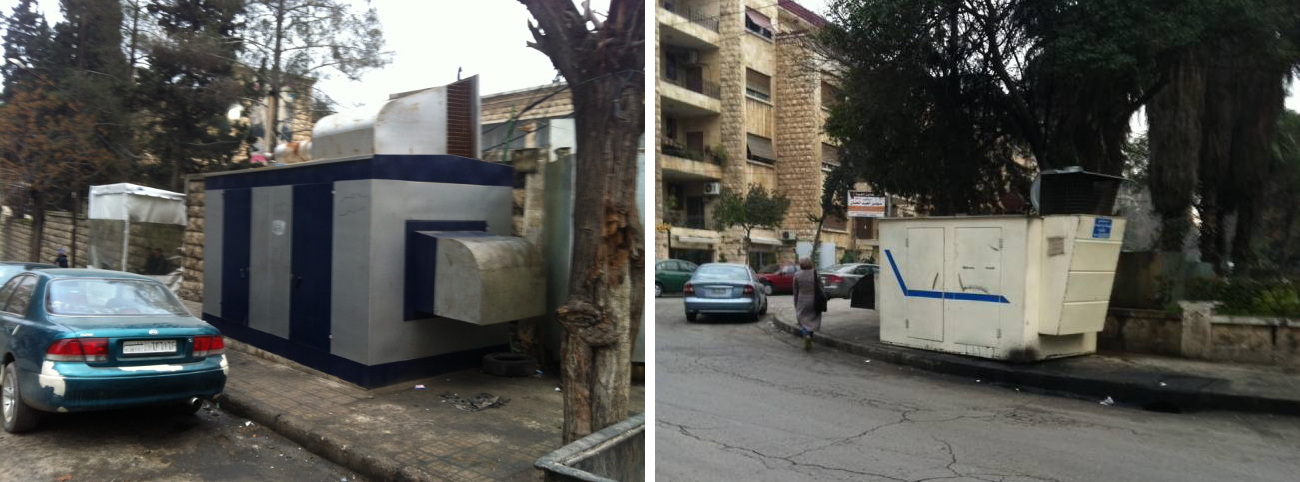 Aujourd’hui, la ville d’Alep est marquée par le développement de réseaux parallèles d’approvisionnement à partir de générateurs de quartier (figure 4). Ces réseaux parallèles demeurent illégaux et ne sont pas institutionnalisés. Ils sont cependant tolérés car indispensables pour faire face à la crise du service public de l’électricité. Cette organisation informelle s’est développée sous les yeux des agents de l’État et souvent en accord avec eux.