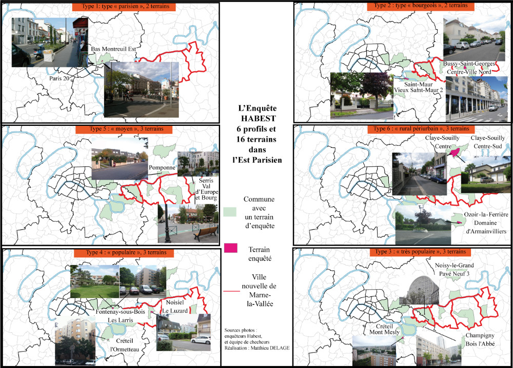 Nous présentons ici les résultats de l’enquête Habest portant sur 275 ménages et 16 quartiers répartis dans 12 communes et qui s’est déroulée en avril 2012. Des typologies croisant les caractéristiques sociales (Clerval et Delage 2014) et celles du logement et la morphologie urbaine des IRIS [2] ont permis de dégager six types de terrain et, parmi eux, seize quartiers où ont été passés les questionnaires (Figure 1) :