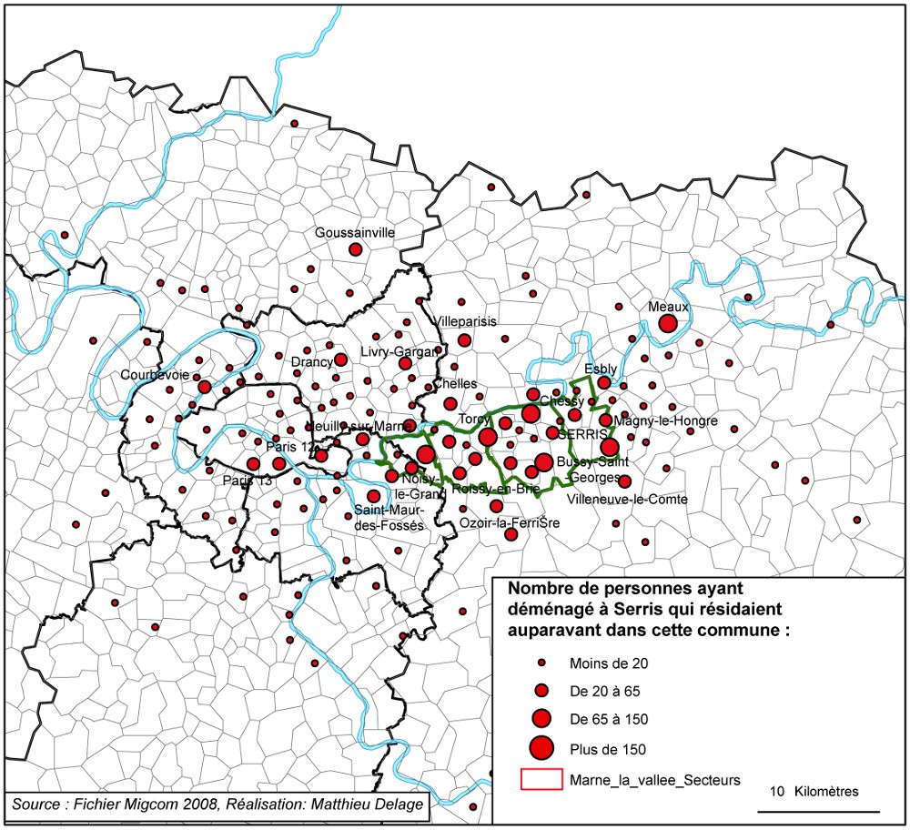 Les parcours résidentiels des nouveaux habitants de ces deux communes se font principalement dans la proximité [3]. La commune de Serris a connu une très forte hausse de sa population (+ 207 % entre 1999 et 2008), surtout due à l’arrivée de nouveaux résidents : 58 % des habitants n’y résidaient pas en 2003, cette réalité n’étant pas compensée par des départs de la commune. Ces nouveaux résidents viennent essentiellement des communes proches (Bailly-Romainvilliers, Bussy-Saint-Georges, Torcy, Noisy-le-Grand), mais aussi des grands pôles de Seine-et-Marne (comme Meaux). Le pouvoir d’attraction de Serris sur les ménages s’exerce dans un rayon de 15 kilomètres environ, au sein duquel ces communes de l’est sont autant de relais et marquent des étapes dans les parcours résidentiels des nouveaux habitants. Ces parcours se font dans un périmètre restreint. Ils renforcent les pratiques spatiales locales et permettent le maintien de liens sociaux entre les communes, donnant ainsi de la cohérence à l’est parisien.