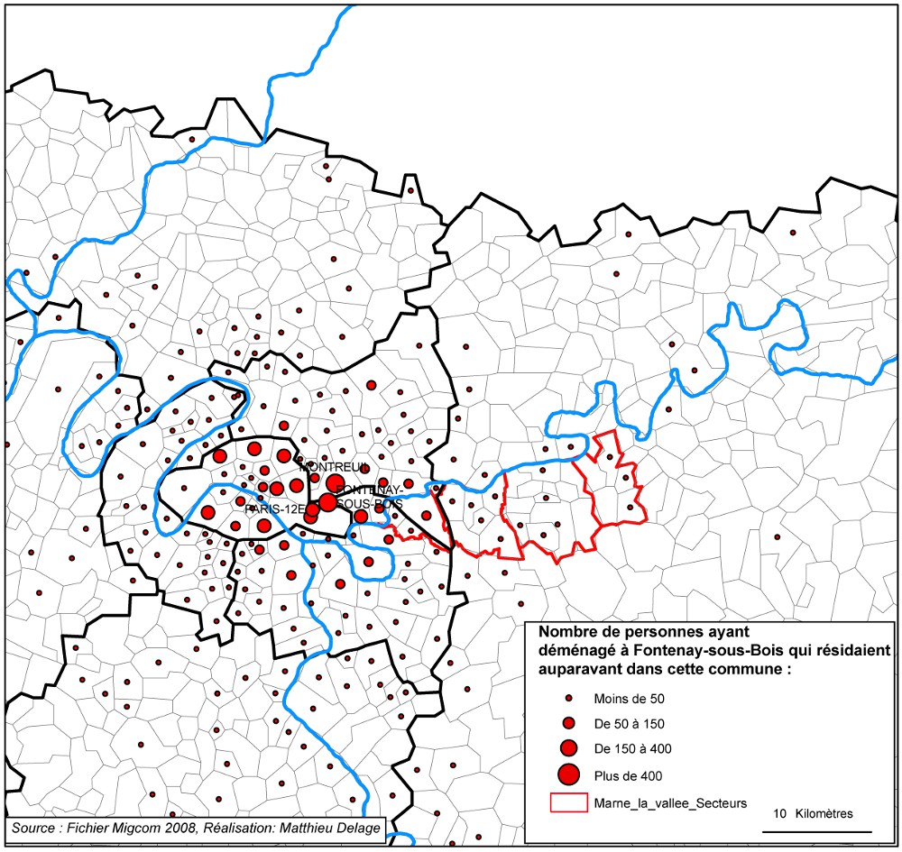 Fontenay-sous-Bois présente des caractéristiques proches, avec toutefois une moins forte arrivée de population extérieure (23 % des habitants n’y résidaient pas en 2003) : les nouveaux arrivants viennent de Paris pour 21 % d’entre eux, puis de la petite couronne, en particulier de Vincennes et de Montreuil. Ces nouveaux habitants proviennent d’un espace plus resserré autour du centre de la métropole parisienne. Ces parcours résidentiels donnent à voir la constitution d’un espace migratoire suivant un secteur est, accréditant l’idée d’un ancrage dans l’est des ménages qui déménagent de proche en proche.