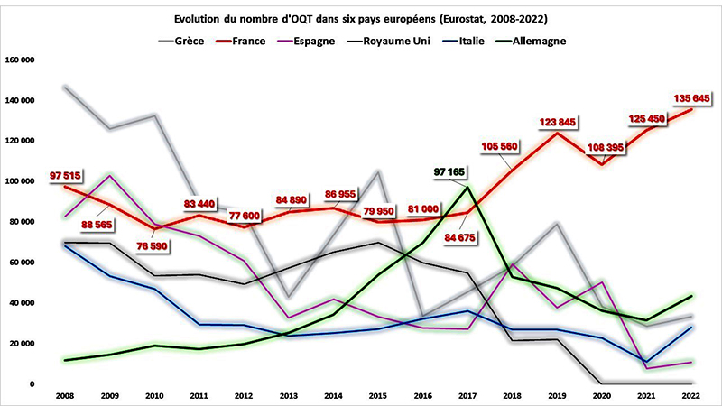 Depuis plusieurs années, la France se situe en revanche à la première place en Europe quant au nombre d’Obligations de quitter le territoire délivrées (figure 5). Non seulement l’administration française produit le plus grand nombre d’OQTF, mais cette production constitue un tiers de toutes les Obligations de quitter le territoire délivrées par trente pays européens.