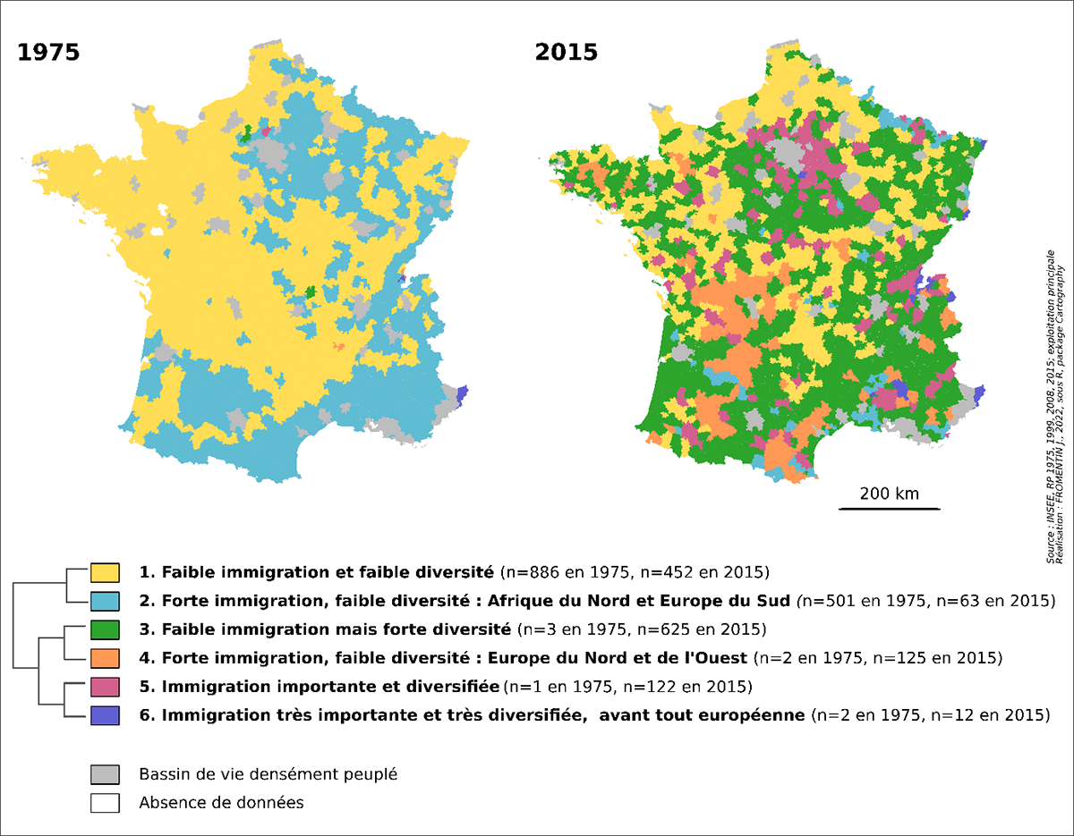 Cette diversification des origines géographiques des immigrés à l’échelle nationale a des effets à l’échelle locale et conduit à l’émergence de territoires eux-mêmes de plus en plus divers (figure 3). Ainsi, on est globalement passé d’une configuration binaire, avec des territoires de très faible immigration (classe 1) et des campagnes marquées par une forte immigration magrébine et sud-européenne (classe 2), caractéristique de l’immigration massive de travail dans le sud et l’est de la France, à des configurations beaucoup plus complexes. On observe, entre 1975 et 2015, l’émergence de nouvelles classes de bassins de vie, caractérisées par une plus forte immigration et/ou une plus grande diversité des origines géographiques représentées.