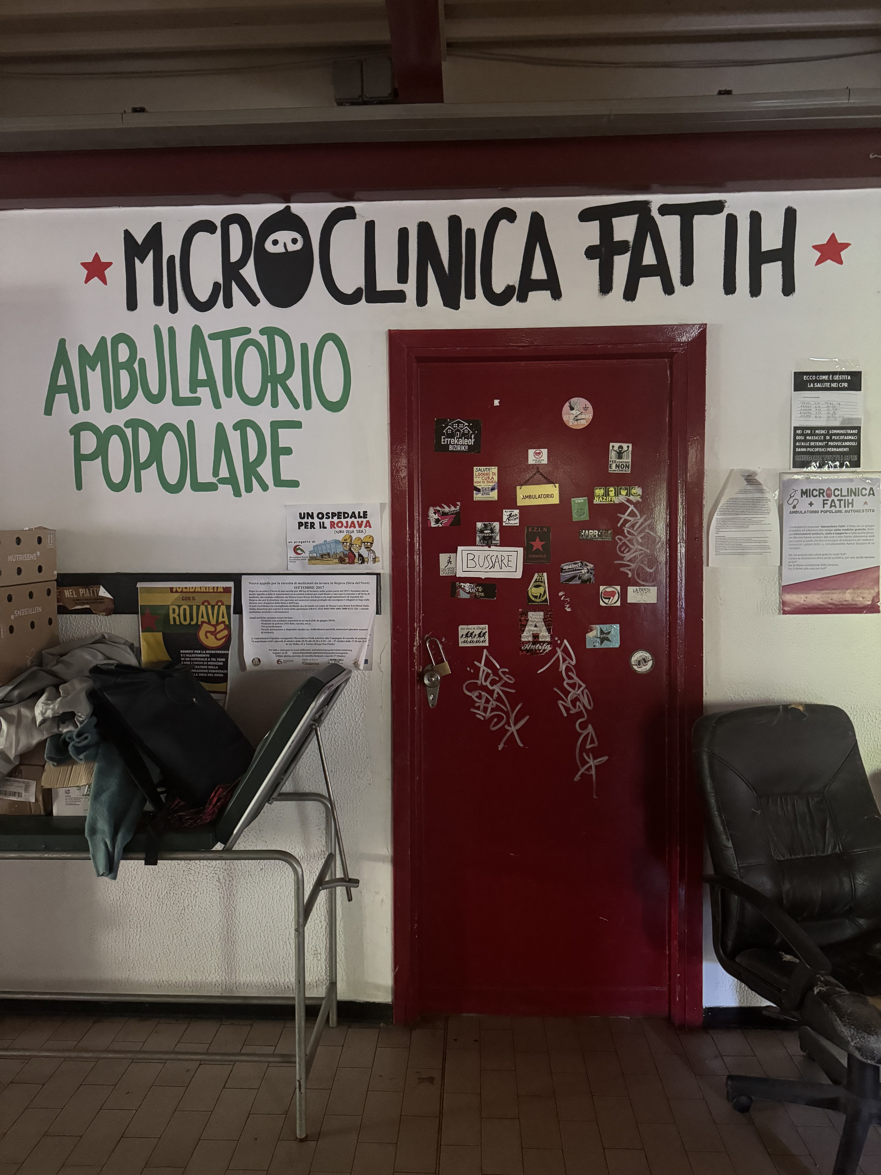 La Microclinica Fatih, créée à Turin en 2009 au sein du CSOA Gabrio, offre un accès direct aux soins primaires et un soutien psychologique en dehors du système public de santé. Elle fonctionne selon un mode autogestionnaire et se réclame de valeurs qui transparaissent dans son nom. Le terme microclinica renvoie à des pratiques de résistance et à une forme de vie collective et communautaire, inspirée des expériences des communautés zapatistes du Chiapas. « Fatih » est le nom d’un homme décédé en 2008 à la suite de négligences médicales dans le centre de détention (centro di permanenza per i rimpatri, CPR) de Turin. Le centre est ainsi porté par un groupe – composé entièrement de membres bénévoles – qui, selon les périodes, oscille entre 10 et 15 militantꞏes et qui est composé pour moitié de médecins et pour le reste de psychologues, d’infirmier·es, de travailleur·euses sociaux·ales et de sociologues.