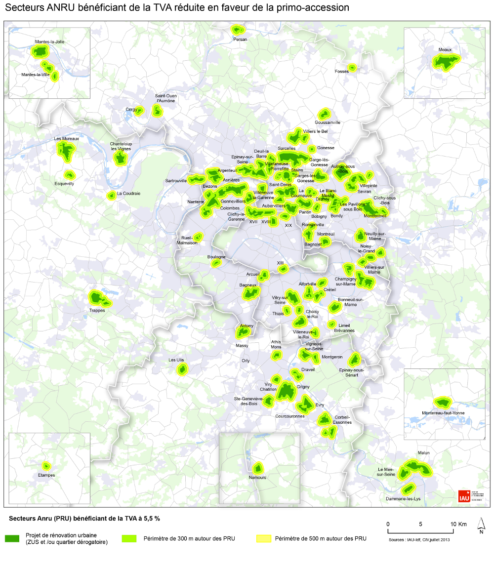 En 2006, dans le cadre de la loi Engagement national pour le logement (ENL), une « TVA réduite » à 5,5 % est mise en place. Au travers de cet instrument fiscal, l’État poursuit deux objectifs : favoriser l’accession à la propriété des ménages modestes et participer à la relance de la construction [1]. Ce dispositif va rapidement avoir un impact sur le Programme national de rénovation urbaine (PNRU) : il s’applique, pour une durée limitée [2], sur les mêmes territoires que les opérations de rénovation urbaine, avec une extension aux zones limitrophes sur 500 mètres d’abord, puis sur 300 mètres depuis le 1er janvier 2014. La « TVA réduite » devait ainsi faciliter l’accession à la propriété des ménages modestes, relancer la construction et permettre une diversification de l’offre de logements dans ou à proximité de certains quartiers de la politique de la ville : les zones urbaines sensibles (ZUS) et les quartiers dérogatoires intégrés dans le PNRU.