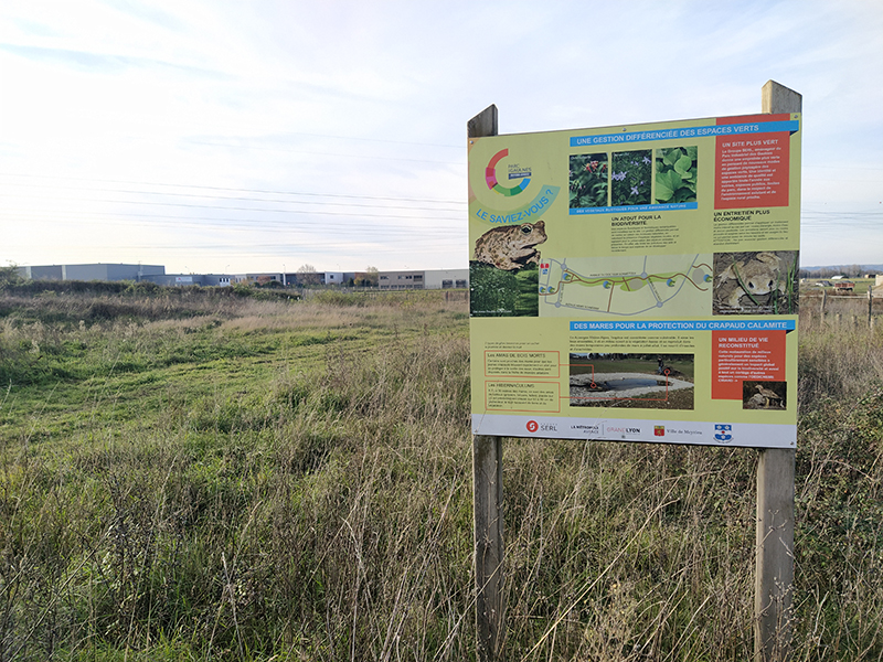 À côté de la cinquantaine d’entreprises installées, le parc d’activités des Gaulnes accueille une végétation abondante. Situé aux franges de la métropole de Lyon, il a été construit en extension de la zone industrielle de Meyzieu, sur 130 hectares d’anciennes parcelles agricoles. À sa commercialisation en 2011, le projet revendiquait « une exigence architecturale et environnementale forte [7] ». L’aménageur souligne les choix engagés du parc d’activités : « À l’époque, on était un peu pionnier sur l’espace vert, on était au-delà des réglementations [8]. » Le parc offre en effet de larges espaces non bâtis, aussi bien publics que privés, favorisant le développement d’habitats d’espèces protégées. Sur le domaine public, le périmètre compte une grande diversité d’espaces plantés ainsi qu’un corridor végétalisé de 15 hectares sous les lignes à haute tension traversant la zone du nord au sud, où la capacité à construire est réduite. Au-delà des aspects fonctionnels, comme le déploiement des modes actifs ou l’infiltration des eaux pluviales, ces surfaces sont aussi des réserves de biodiversité. Le terrain loge des crapauds calamites [9]. La Région y a compensé écologiquement l’artificialisation d’un site pour la construction d’un lycée à proximité. Elle a racheté à la métropole de Lyon une partie du foncier public non artificialisé vouée à la préservation des œdicnèmes criards, une espèce d’oiseau protégée [10]. Sur le domaine privé, la métropole souhaitait proposer de vastes surfaces à construire aux entreprises. Ces parcelles, allant jusqu’à 20 hectares, offrent aujourd’hui des conditions favorables au développement de la biodiversité. Deux entreprises accueillent des refuges de la Ligue pour la protection des oiseaux (LPO), gage de leurs contributions aux enjeux environnementaux.
