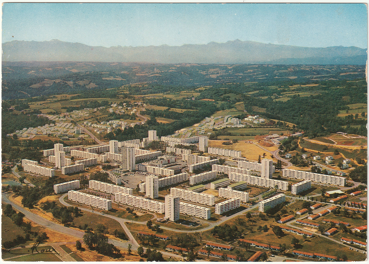 Les cartes postales des grands ensembles véhiculent le récit institutionnel en donnant une vision stéréotypée de la modernisation architecturale, du fait des conventions photographiques adoptées. En effet, ce sont pour l’essentiel des vues aériennes, technique adoptée à partir des années 1950 par les éditeurs de cartes postales. Ces images sont de deux types : vues obliques d’ensemble prises à moyenne altitude, soulignant la composition géométrique et la monumentalité, et vues à faible altitude qui détaillent des immeubles, des équipements et parfois des usages (Pousin 2012, p. 210-11) (figures 1 et 2). Ainsi, la sélection de cartes postales présentée dans l’ouvrage montre d’une part la cohérence des projets architecturaux du mouvement fonctionnaliste moderne, d’autre part une grande diversité des sites et des ensembles, souvent réalisés par des architectes de renom, différents pour chaque opération.