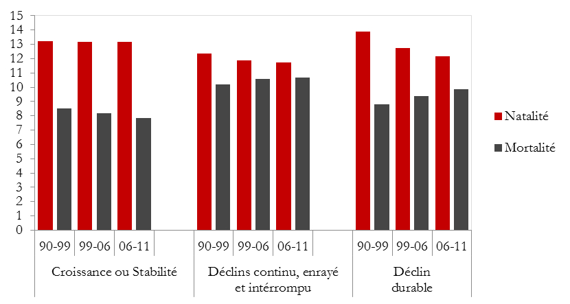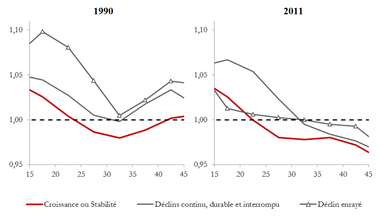La fécondité de la France, parmi les plus élevées des pays européens (Mazuy et al. 2013), permet jusqu’à présent de contenir le phénomène de décroissance urbaine grâce à une composante naturelle positive. Mais cette forme spécifique de vieillissement « de l’entre-deux » tend à en neutraliser les effets. Cela s’observe pour l’ensemble des aires urbaines en déclin, mais la rapidité du processus est particulièrement saisissante au sein des aires urbaines en « déclin durable » (figure 9). Dans ces dernières, le taux d’accroissement naturel a ainsi chuté de 5,1 ‰ en 1990 à 2,3 ‰ en 2011.