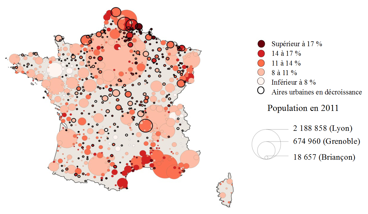L’une des conséquences du passé industriel des aires urbaines en déclin est que leur population active est plus ouvrière et moins diplômée. En 2011, on comptait 3 ouvriers pour 10 actifs occupés résidant dans des villes décroissantes, contre seulement 2 sur 10 dans les autres. Cette structure socio-économique de la population active de ces villes résulte non seulement d’un manque d’attractivité mais également d’une mobilité résidentielle sélective, puisque les jeunes actifs qualifiés ont une plus grande propension à émigrer que les ouvriers (Rudolph 2015).