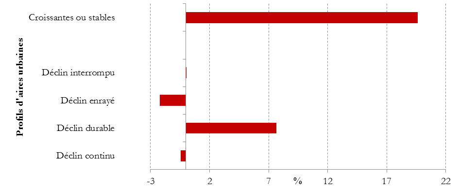 Toutefois, malgré cette perte de vitesse du secteur industriel, la part des emplois de fabrication y reste encore supérieure à celle observée dans les aires urbaines en croissance. Là où le déclin est enrayé, par exemple, malgré une baisse de 43 % des emplois de fabrication entre 1990 et 2011, le secteur industriel pèse encore deux fois plus lourd que dans les aires urbaines qui gagnent de la population (16,5 % contre 8,1 %). Les emplois des secteurs du bâtiment et des travaux publics (BTP), du transport, de la logistique, de l’entretien–réparation et de l’agriculture sont également surreprésentés, alors que les secteurs de la distribution et des services sont moins dynamiques. Ainsi, les aires urbaines en décroissance se caractérisent par la faiblesse de leur économie présentielle – qui regroupe des activités telles que les services domestiques ou le commerce de détail ayant vocation à répondre à la demande locale (Davezies 2009 ; Talandier 2013) [7] –, qui s’explique, entre autres, par une plus grande difficulté à attirer ceux qui sont considérés comme les moteurs de cette économie : touristes, retraités ou encore étudiants.