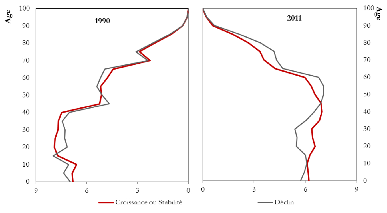 Le vieillissement dans les aires urbaines qui bénéficient d’une croissance démographique s’avère relativement classique : l’augmentation de l’espérance de vie entraîne un vieillissement « par le haut » et la baisse de la natalité un vieillissement « par le bas » (figure 8). À cela s’ajoute, pour les aires urbaines en décroissance, une perte importante d’individus âgés de 20 à 39 ans. Elles sont en effet soumises à ce que l’on pourrait appeler un vieillissement « de l’entre-deux », opérant en deux temps : un premier temps où la poursuite d’études supérieures et l’insertion professionnelle favoriseraient le départ de ces classes d’âges et, par complémentarité, une surreprésentation des plus âgés, puis un second temps où le déficit de ces classes d’âges, par ailleurs plus fécondes, entraînerait une baisse de la natalité et par la suite un creusement du corps de la pyramide des âges.