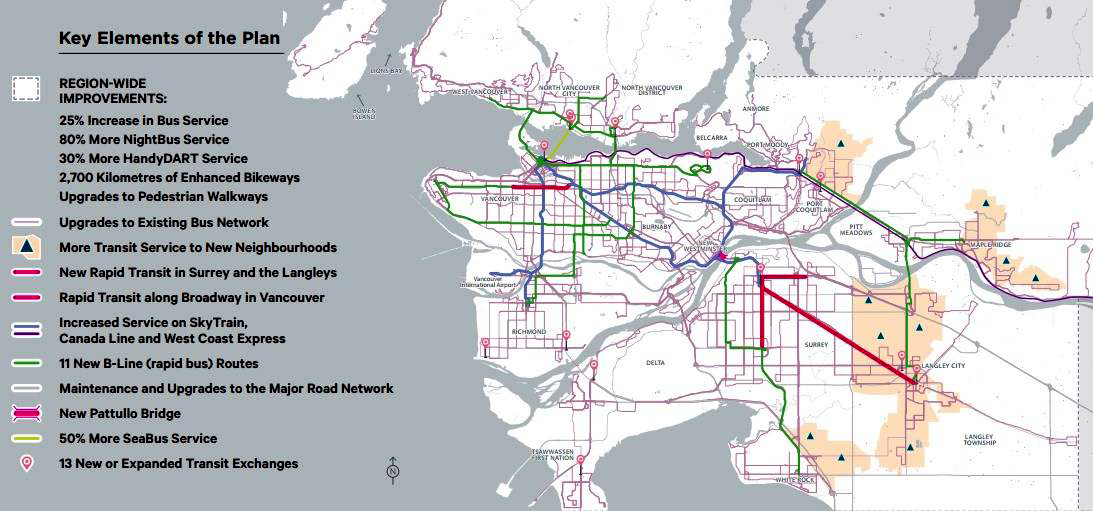 Si, sur le temps long, un consensus relatif existe autour de cet objectif de compacité, celui-ci a plus récemment donné lieu à des débats et des controverses. Le référendum organisé en 2015, au niveau métropolitain, sur la mise en place d’une taxe de 0,5 % (Metro Vancouver Congestion Improvement Tax) pour financer un nouveau plan de mobilité proposé par le conseil des maires en est l’illustration la plus saisissante (fig. 5). Ce référendum, imposé par le gouvernement provincial (de sensibilité politique libérale), portait sur un plan de création d’une nouvelle ligne de métro, de multiplication de lignes de bus rapides, de financement de voies cyclables et pédestres, et plus globalement d’amélioration des offres de transport collectif (fig. 6). L’instauration d’une taxe (200 millions de dollars de revenus par an) pour financer ce plan a reçu un soutien institutionnel fort de l’ensemble des municipalités, des groupes environnementaux, des milieux académiques, des milieux d’affaire et d’une grande partie de la presse. Cette taxe a été cependant largement rejetée (62 % de non). Les travaux de Kyle Willmott (2017) sur ce référendum ont éclairé ce paradoxe d’une métropole progressiste marquée par un référentiel de liveability et un rejet d’une taxe acceptée dans d’autres contextes urbains moins marqués par ces politiques de mobilité durable (Los Angeles, Seattle, Atlanta). Cet auteur indique que, davantage qu’un rejet du plan, le référendum s’est transformé en plébiscite anti-Translink. Cette critique de l’Agence provinciale des transports portait sur sa légitimité à piloter et mettre en œuvre efficacement le plan prévu par le conseil des maires. Elle a notamment été orchestrée par la puissante fédération nationale des « payeurs de taxe » (Canadian Taxpayers Federation) très présente dans les débats politiques au Canada. Certes, ce vote n’a pas stoppé la poursuite des politiques en faveur de la mobilité. Il a été décidé, après ce résultat négatif, que celles-ci seraient financées par une augmentation des taxes de propriété, du prix des tarifs de transport, des taxes sur l’essence, à quoi est venu s’ajouter le soutien du gouvernement fédéral (nouveau fonds pour les politiques de transport collectif au Canada décidé par le gouvernement Trudeau). Mais ce résultat implique néanmoins une négociation nouvelle de nature politique entre municipalités [7], au sein du conseil des maires, pour discuter de la validation et du phasage prioritaire des projets.