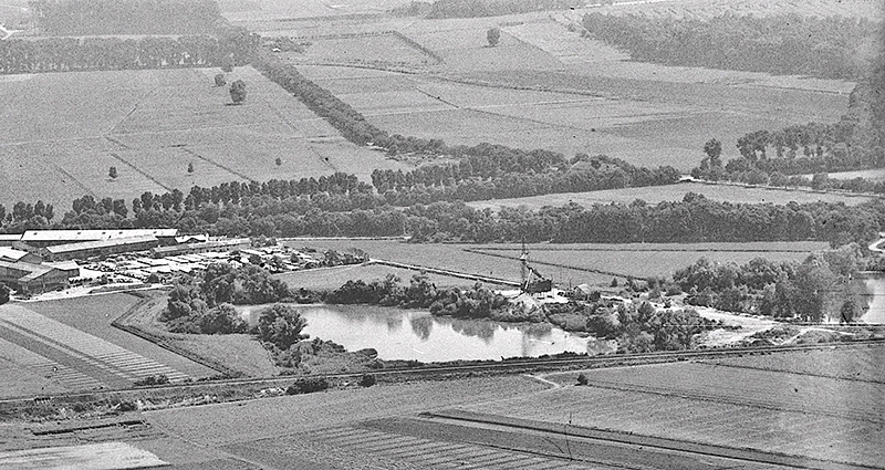 L’inventaire de celles-ci amène à considérer en premier lieu les manifestations de l’urbanisation. La seconde moitié du XXe siècle est en effet caractérisée par une explosion de l’étalement urbain sur la ceinture maraîchère (Bastié 1971). Surtout, c’est la planification étatique du développement de l’agglomération parisienne qui décide, à partir de 1965, avec le Schéma directeur d’aménagement et d’urbanisme de la région parisienne (SDAURP), de sacrifier sur l’autel des autoroutes, des zones commerciales et industrielles et des villes nouvelles une partie conséquente des terres agricoles franciliennes. Les champs d’épandage, voisins de la ville nouvelle de Cergy-Pontoise, en sont victimes. De surcroît, l’urbanisation a des conséquences indirectes mais tout aussi dangereuses : avec elle croît la pression sur les ressources dont elle dépend (pierres, sables, graviers) (Magalhães 2024). Les terrains irrigués, qui cachent dans leurs sous-sols de substantiels gisements alluvionnaires, sont sujets à partir des années 1960 à une prédation jusqu’alors inédite : celle des prospecteurs de sables et des producteurs de béton (figure 2).