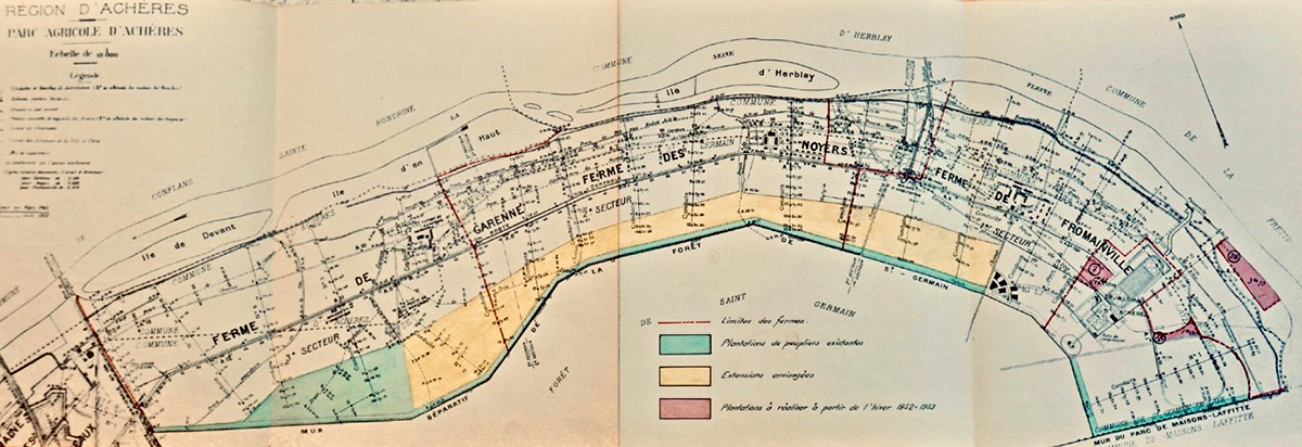 Aussi, les épandages agricoles d’eaux usées connaissent de nombreuses adaptations pour faire face autant aux évolutions de la ceinture maraîchère qu’aux problèmes techniques qu’ils posent (colmatage des sols, apparition de carences ou prolifération de plantes indésirables, etc.). Après plus d’un demi-siècle d’irrigations, ceux-ci tendent à s’exacerber. Ils font soit l’objet d’ajustements des pratiques culturales, soit suscitent d’ambitieux projets pour les résorber : développement de l’embouche, plantation d’une forêt, etc. (figure 3). Face à l’urbanisation et à ses corrélats, une politique de compensation des pertes de terrains agricoles, d’abord surfacique puis dans un second temps monétaire, voit aussi le jour. Elle semble préfigurer certaines mesures de compensation environnementale, avec l’ensemble de leurs biais : abstraction croissante de l’environnement, marchandisation, etc. (Devictor 2018). Du même coup, en parvenant à l’issue d’un procès l’opposant à l’État aménageur à faire reconnaître par des instances législatives un droit d’usage pour des terrains qu’elle ne possède pas, la ville de Paris maintient quelque temps par cette politique la primauté des usages communs sur le droit de propriété et la planification métropolitaine.
