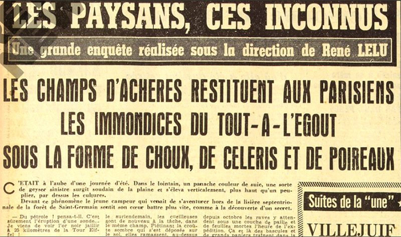 Jusqu’aux années 1970, ce territoire continue d’être valorisé symboliquement, autant dans les discours des acteurs impliqués (ingénieurs, cultivateurs, édiles) que des observateurs (universitaires, journalistes) (figure 1). In fine, bien qu’ayant été imposé à la fin du XIXe siècle aux communautés rurales de l’aval de la Seine par la ville industrielle (Carnino 2013), l’épandage agricole semble toujours, après la Seconde Guerre mondiale, s’y déployer avec succès. Dans les plaines concernées, il reste malgré son importante infrastructure une « technique médiatrice », au sens de l’historien Lewis Mumford (2021), c’est-à-dire encore relativement démocratique, inscrite territorialement, à échelle réduite et reposant sur des compétences humaines.