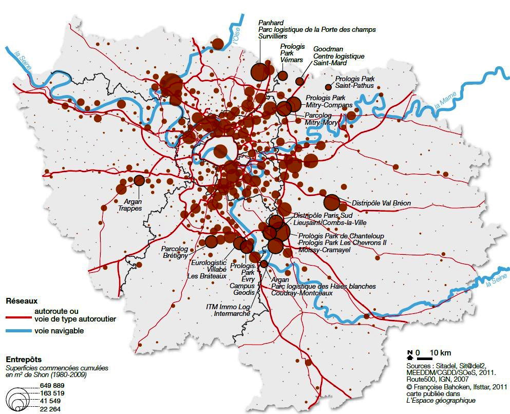 Carte publiée dans : N. Raimbault, « Logistique : émergence d’un nouveau marché immobilier », Note rapide de l’IAU Île-de-France, n° 666, 2014, Paris. URL : www.institutparisregion.fr/fileadmin/NewEtudes/Etude_1086/NR_666_web_derniere_version.pdf.