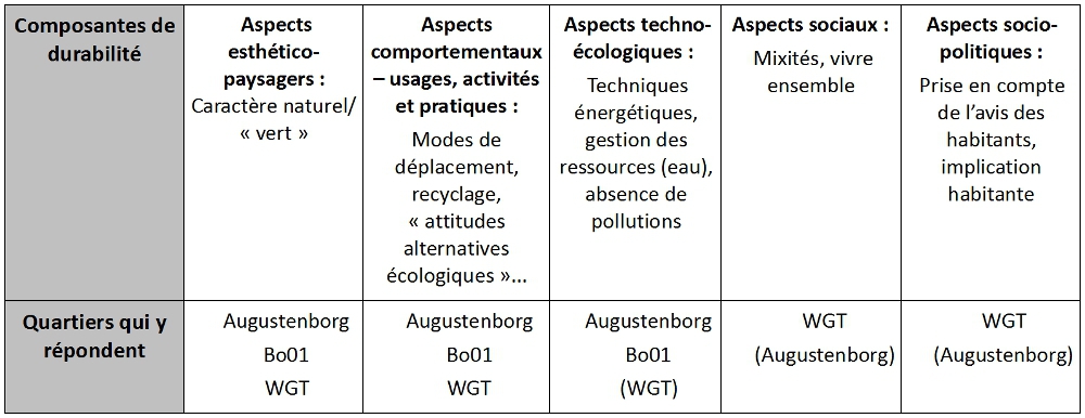 Ces mêmes habitants font ressortir de l’idée de « quartier durable » cinq composantes fondamentales et idéelles qui se croisent avec les valeurs véhiculées par le paysage. Il s’agit des aspects techno-écologiques (techniques énergétiques ; gestion des ressources ; notamment en eau ; absence de pollutions) ; des aspects sociaux (mixité, vivre ensemble) ; des aspects socio-politiques (prise en compte de l’avis des habitants, implication habitante) ; des aspects esthético-paysagers (caractère naturel, « vert ») ; et des aspects comportementaux (modes de déplacement, recyclage, « attitudes alternatives écologiques »…). Ces composantes sont inégalement présentes dans les quartiers étudiés.