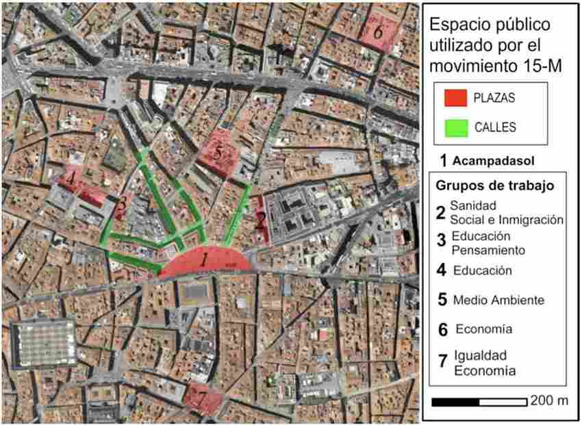 La singular acampada urbana de la Puerta del Sol se ha convertido en un “espacio habitable y funcional”, utilizando todos los elementos urbanos. La sombra en la plaza es inexistente, por lo que los toldos se han apoyado en las farolas y kioscos, además de en algunas columnas de madera que se han instalado. Incluso se ha utilizado la arena que rodea una de las fuentes para hacer un pequeño huerto urbano. Por último, hay que destacar la importancia de la accesibilidad del lugar para el tráfico rodado, ya que ha permitido el abastecimiento (materiales de construcción y mobiliario, equipos de sonido y de proyección, alimentos, etc.), así como asegurar la entrada de los servicios de limpieza y servicios médicos.