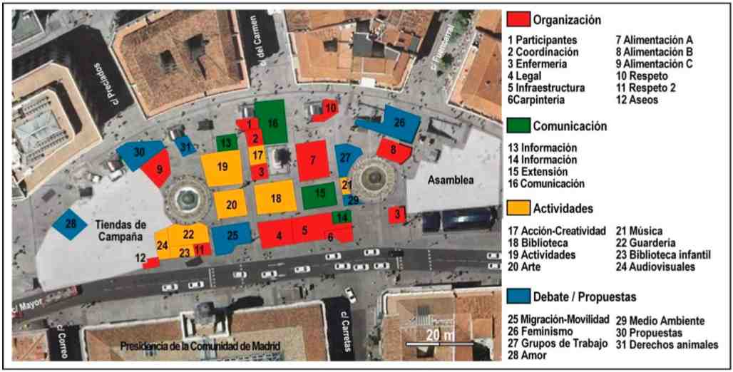 La “acampada” de Sol no ha sido un simple campamento. Se ha creado en la plaza una pequeña ciudad, con un autogobierno horizontal. Se han reproducido prácticamente todos los equipamientos y servicios necesarios para que funcione una ciudad (figura 7): alimentación, enfermería, infraestructura, cobertura legal, y hasta una guardería (figura 8). Por una parte están las comisiones encargadas del buen funcionamiento de la “ciudad” y por otra los grupos de trabajo que formulan las propuestas e ideas que finalmente se aprueban en las asambleas generales [12] (figura 9).