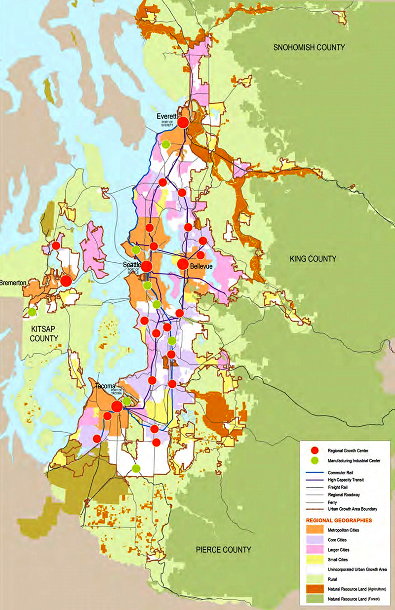 La municipalité de Seattle a également développé un Transit Master Plan (dont la dernière révision date de 2016), qui centralise les politiques de transport. Selon l’objectif de la municipalité, d’ici 2030, plus de 90 % de la croissance de la population et plus de 60 % des nouveaux emplois doivent se concentrer dans les « Urban Centers » et les « Urban Villages » désignés [5] (City of Seattle DOT 2016).