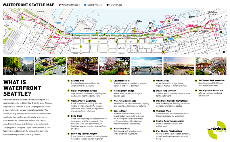 Le front d’eau, désormais libéré de l’Alaskan Way Viaduct et déjà incontournable pour les touristes, est appelé à devenir un haut lieu récréatif, avec des promenades aménagées, des quais repensés, une extension de l’aquarium, l’implantation de nouveaux commerces et la construction d’une promenade et d’un belvédère sur le toit de l’extension de l’aquarium (l’Overlook Walk). La mise en tourisme [7] est donc aussi un objectif largement mis en avant dans ce réaménagement, dans la tradition de revitalisation des waterfronts étatsuniens avec le développement d’activités commerciales, la transformation de ces fronts d’eau en quartiers touristiques (dans la logique des festival marketplaces) et l’implantation de grands équipements générateurs de flux.