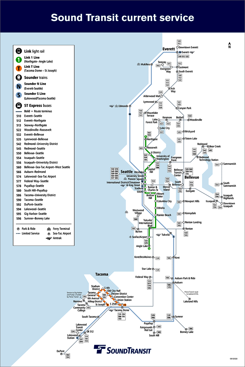 Le réseau des lignes de tramway dessert la ville-centre (en vert) ainsi que le centre-ville de Tacoma (en orange). Le réseau des lignes de bus en site propre et le réseau de trains régionaux Sounder figurent également.
