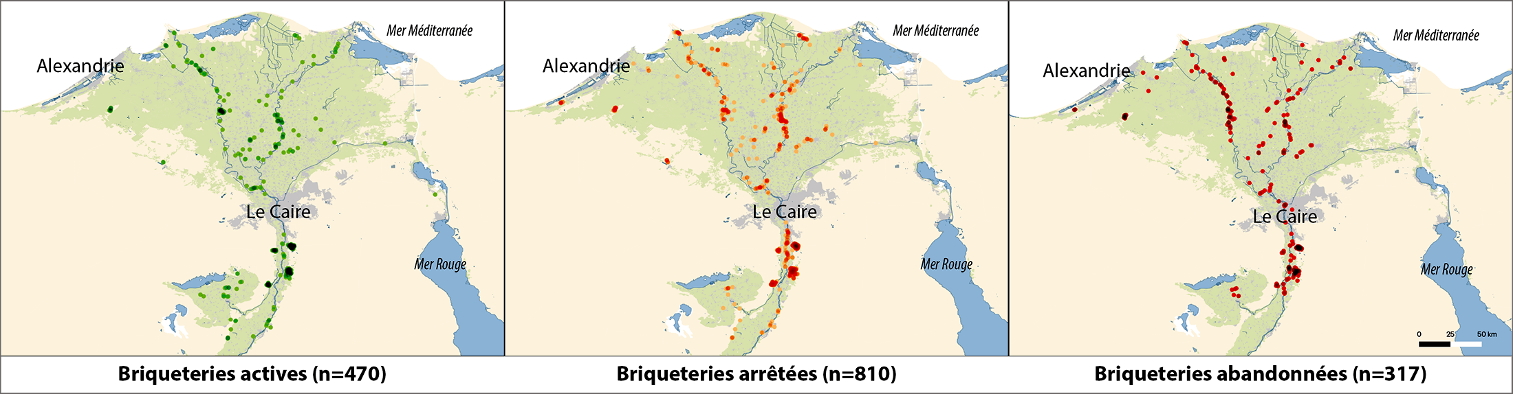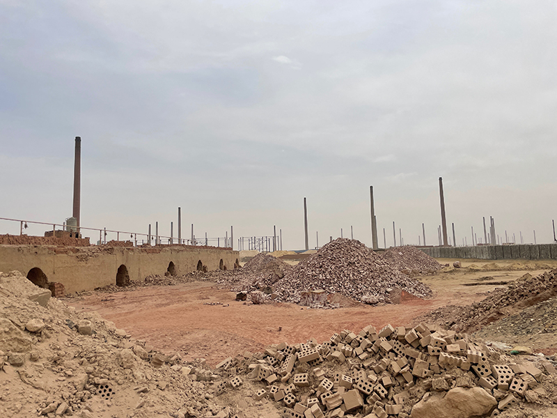 La brique rouge est un matériau de construction omniprésent dans la capitale égyptienne. Elle est majoritairement composée de terres argileuses qui sont mixées, puis moulées en briques. Celles-ci sèchent ensuite à l’air libre, avant d’être cuites dans des grands fours circulaires (figure 2) puis livrées sur le chantier. Les principales zones de production sont situées à environ 45 km au sud du Caire, mais des usines sont également réparties tout le long du Nil et de ses affluents dans les régions du Delta. La majorité des propriétaires ne détiennent qu’une ou deux briqueteries, chacune employant en moyenne 150 ouvriers et pouvant produire jusqu’à deux millions de briques par semaine.