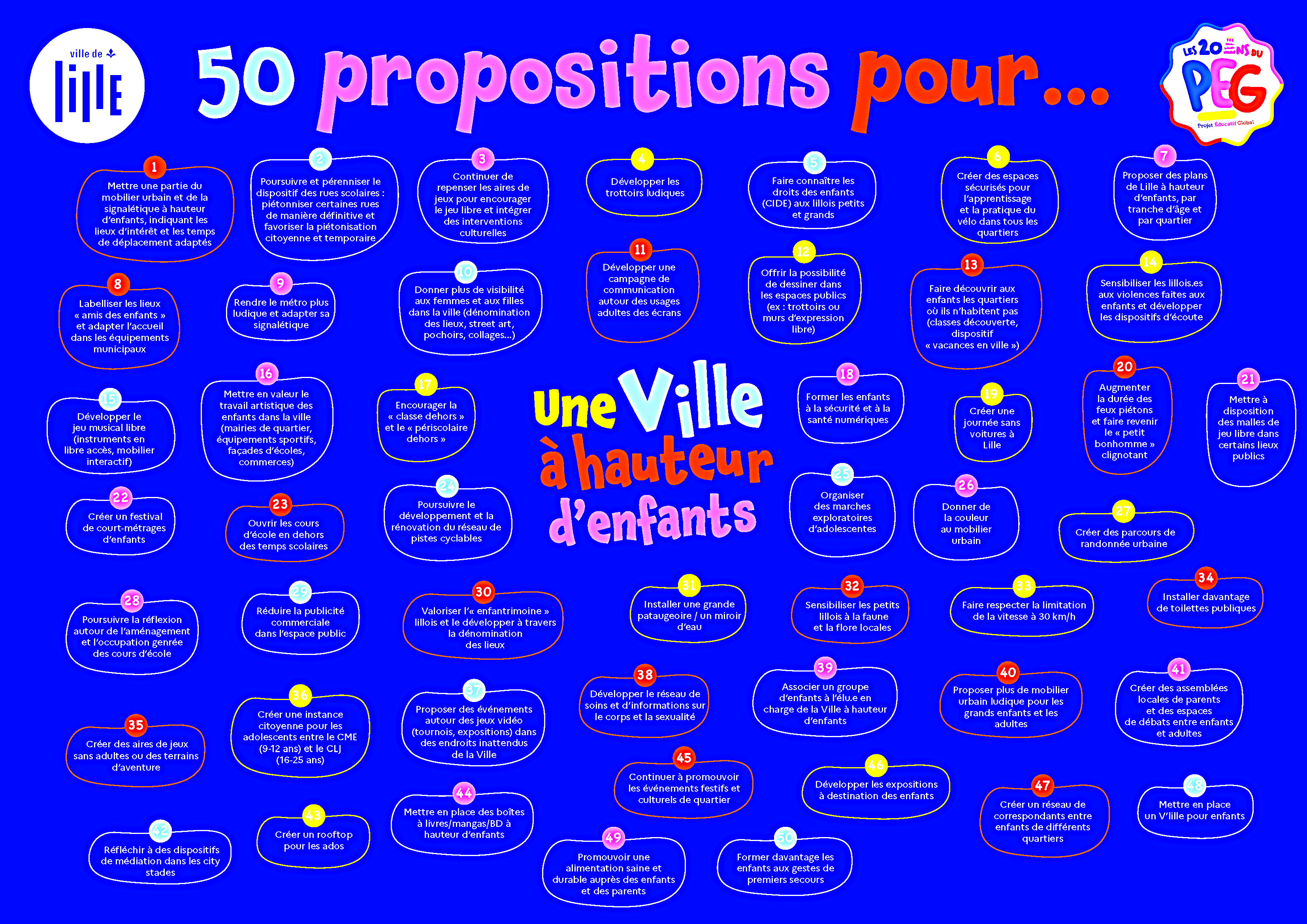 À la rentrée 2024, le Laboratoire s’est réuni pour élaborer une liste de propositions d’actions concrètes découlant de la réflexion collective autour des principes exposés dans la charte. Trois réunions plénières et une séance resserrée autour d’un groupe de travail ont permis de faire émerger « cinquante propositions pour une ville à hauteur d’enfants » (figure 2), remises au nouveau maire Arnaud Deslandes le 30 avril 2025, à l’occasion de l’inauguration de l’exposition Mom’Art à la gare Saint-Sauveur.