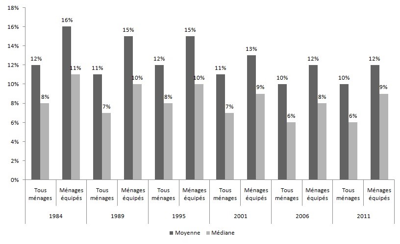 Source : Enquêtes Budget de famille 1984, 1989, 1995, 2001, 2006 et 2011. Champ : Ensemble des ménages. Note de lecture : En 1984, 12 % du budget des ménages est consacré en moyenne à la dépense en automobile. À la même date, la moitié des ménages dépensent moins de 8 % de leur budget dans le poste automobile.