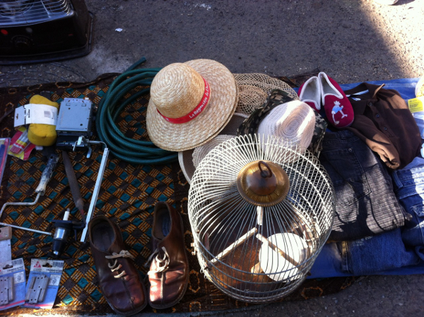 « Moi, où j’aime aller, c’est ici ; les meilleures affaires, c’est ici ; les vendeurs ne paient pas leur place ; les autres, au marché à l’intérieur, paient de 10 à 20 euros. C’est pas rentable pour eux qui vendent trois trucs. Ils gagnent à peine 20, 30 euros par jour. Je préfère faire profiter ceux qui ont moins de moyens… Je trouve mon bonheur des fois ici ; c’est un vrai plaisir, c’est une passion, trouver des trucs pas chers parce que, moi, je suis plus contente de choses achetées aux puces qu’au magasin ; on fait une bonne affaire. Et puis lorsque je pars avec 10 ou 15 euros, arrivée là-bas, j’ai déjà plus rien, je ne peux pas aller plus loin ! »
