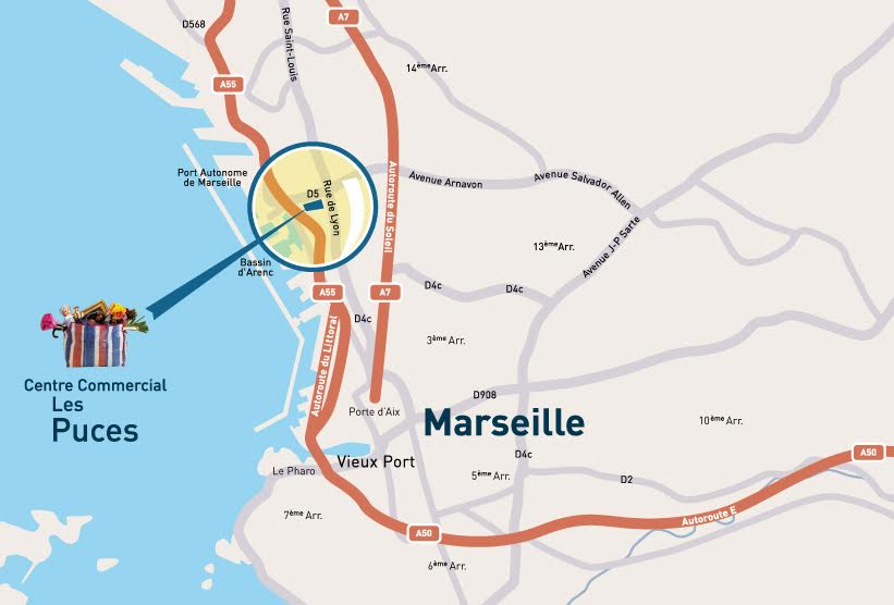 Photos © Michèle Jolé, 2015. Carte : Centre commercial des Puces de Marseille.