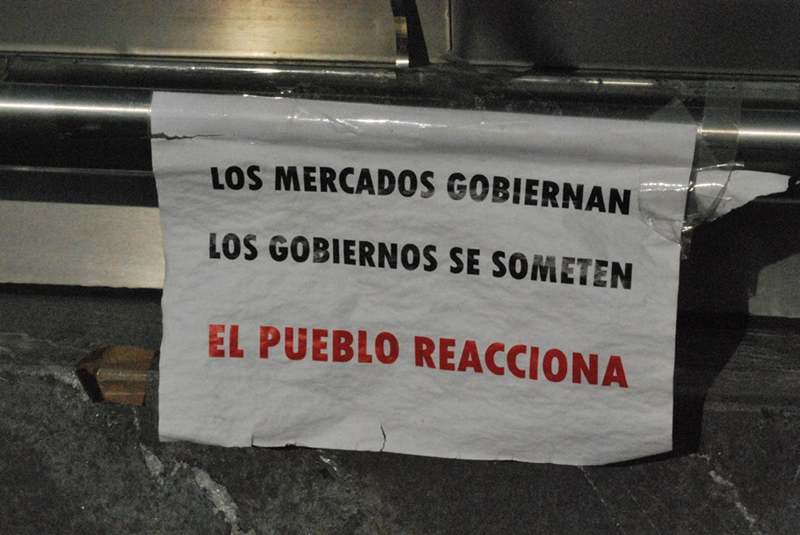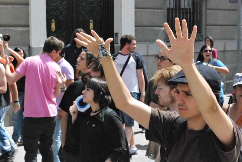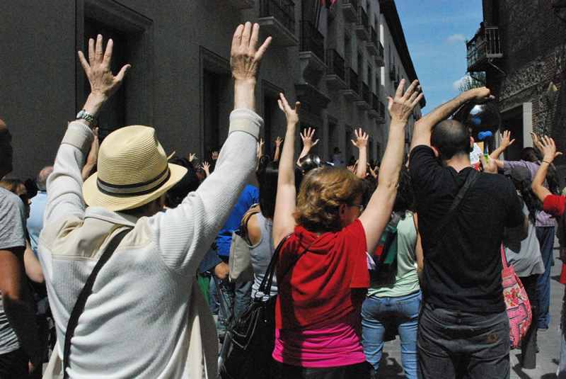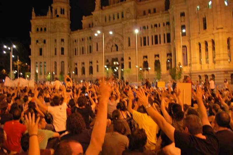 On peut craindre, d’autre part, une dispersion dans la multiplication des appels à manifester – les premières assemblées populaires de Madrid ont annoncé de nombreuses manifestations en juin et juillet, pour protester par exemple contre la privatisation d’un canal, les coupes dans le budget de l’éducation ou la réforme des retraites. Un participant regrette cette inflation : « Je ne peux pas être tous les jours dans la rue ! Il faut éviter que la dispersion diminue le dynamisme du mouvement. Nous avons beaucoup de choses à faire au niveau local, il ne faut pas seulement faire de grandes manifestations ». La protestation organisée le samedi 11 juin devant l’Hôtel de ville, au moment de l’investiture de la nouvelle équipe municipale, a entraîné une moindre affluence dans les assemblées de quartier prévues ce jour-là, voire leur annulation comme à Lavapiés – une décision prise par consensus, même si un participant estime qu’« il faudrait au moins que les commissions nous informent de leur travail, pour maintenir la force de l’assemblée du quartier. Maintenant on a plus besoin de ça que de protester ». Ces grandes manifestations communes à l’ensemble des quartiers de Madrid permettent toutefois d’éviter un enfermement local du mouvement, alors que les origines de nombreux problèmes soulevés par les indignés (comme la crise économique et politique) sont globales. Elles témoignent également de la vitalité du mouvement après la levée du campement Puerta del Sol. Ainsi, la journée d’action contre le Pacte de l’Euro, dimanche 19 juin, a rassemblé environ 40 000 manifestants dans les rues de Madrid, organisés en six colonnes partant des périphéries de la ville, et plus de 200 000 en Espagne [5]. Depuis, des marches populaires sont organisées à travers le pays, au départ notamment de Valence et de Barcelone, et il est prévu qu’elles se rejoignent à Puerta del Sol le 23 juillet.