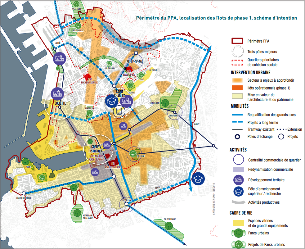 Recouvrant près de 1 000 hectares et concernant plus de 200 000 habitants (voir carte ci-dessous), le PPA de Marseille se distingue par l’ampleur de son périmètre et de ses défis : signé en 2019, au lendemain des effondrements tragiques de la rue d’Aubagne, il devient l’outil de lutte contre l’habitat indigne au sein du centre-ville. Il vise en outre à définir un horizon stratégique territorial intégrant les questions d’espaces publics, d’équipement, de mobilités, de développement économique, etc.