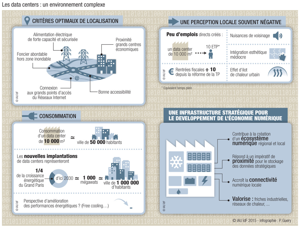 Les data centers franciliens sont principalement implantés au cœur de la métropole et particulièrement dans sa partie nord. Trois grandes zones se distinguent : Paris intra-muros, le secteur de la Défense et les communes limitrophes et, surtout, le territoire de Plaine Commune : Aubervilliers, Épinay-sur-Seine, L’Île-Saint-Denis, Pierrefitte-sur-Seine, Saint-Denis, Saint-Ouen, Stains et Villetaneuse.