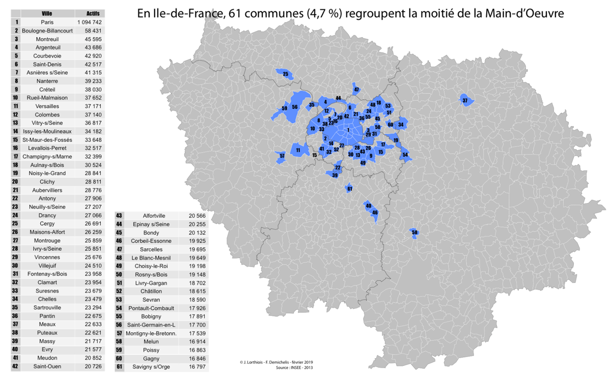 Sur la seconde carte, on observe une dispersion trois fois plus élevée de la main-d’œuvre, qui reflète bien la localisation géographique de la population francilienne et l’histoire de l’urbanisation : 61 communes sur 1 274 – soit 4,7 % – regroupent la moitié des actifs franciliens ayant un emploi. Sans surprise, les deux cartes traduisent la dissociation domicile/travail qui caractérise l’Île-de-France et les besoins de mobilité qui en résultent.