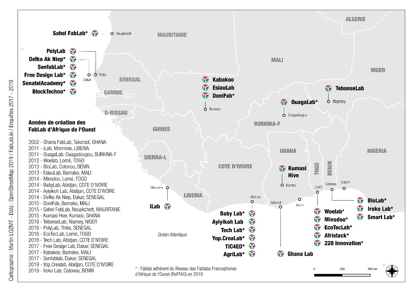 Les premiers fablabs ouvrent leurs portes dans les années 2010 en Afrique de l’Ouest francophone. Ils s’inspirent clairement des premiers laboratoires d’innovation numérique français (Artilect à Toulouse, ElectroLab à Nanterre…). Grâce à des rencontres faites au cours de Bootcamps (session intensive de formation au numérique) organisées dans les capitales africaines, certains individus s’intéressent au modèle fablab et l’importent en Afrique. C’est ainsi que, suite au Forum InnovAfrica à Ouagadougou en 2011, Gildas Guiella, jeune entrepreneur du numérique, crée le OuagaLab au Burkina Faso. La dynamique prend également au Togo. Après avoir créé, en 2010, L’Africaine d’architecture, une plateforme de réflexion sur les villes intelligentes, Sénamé Koffi Agbodjinou, architecte et anthropologue, fonde en 2012 le Woelab à Lomé. Sa route croise celle de Médard Agbayazon, jeune informaticien Béninois, qui vient de découvrir les premiers fablabs en France. En 2013, ce dernier crée le BloLab (littéralement « faire ensemble ») à Cotonou pour favoriser la démocratisation du numérique. En 2014, un collectif conduit par Edwige Gbogou ouvre le BabyLab, un espace d’expression et de créativité dans un quartier populaire d’Abidjan. La même année, le fablab sénégalais Defko Ak Niep (« Fais-le avec les autres »), lié à l’espace culturel Kër Thiossane, vient compléter le réseau des espaces innovants à Dakar.