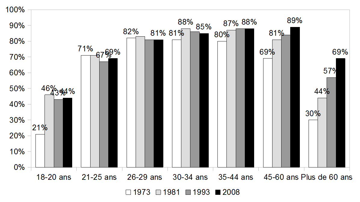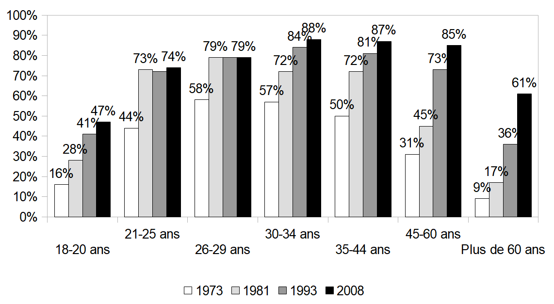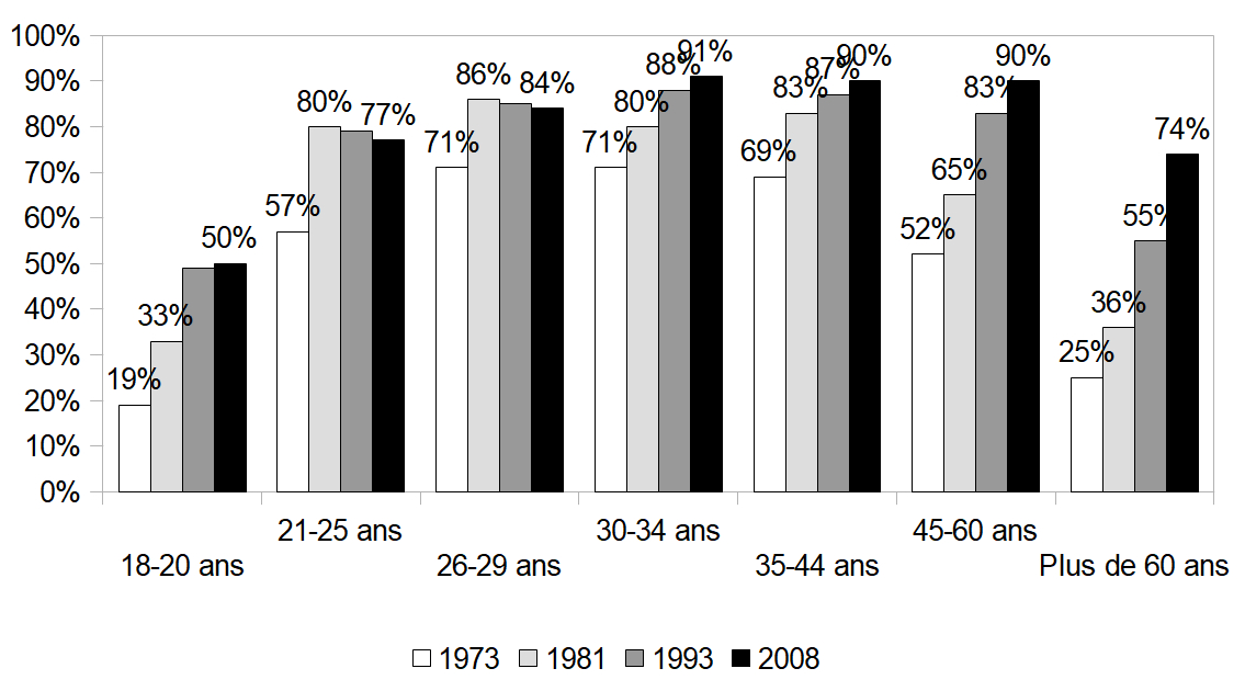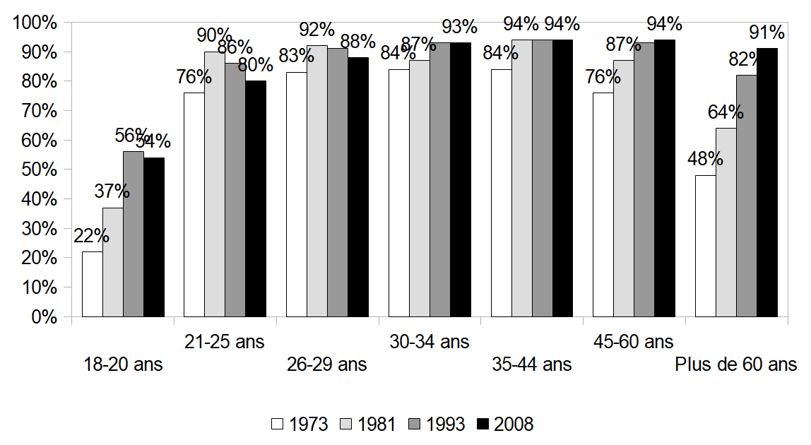 Le taux de détention du permis de conduire a connu un accroissement très élevé auprès des plus jeunes : alors que les 18‑20 ans étaient 19 % à détenir le papier rose en 1973, ils étaient exactement 50 % en 2008. Au cours de cette période, on n’assiste donc pas à une désaffection du permis de conduire, mais au contraire à sa diffusion massive parmi les plus jeunes. La décennie 1970, durant laquelle les jeunes cohortes du baby boom accèdent massivement au volant (Demoli 2015a), a vu un essor particulièrement élevé du taux de détention pour cette tranche d’âge, alors que les autres décennies montrent un mouvement de croissance de moindre ampleur.