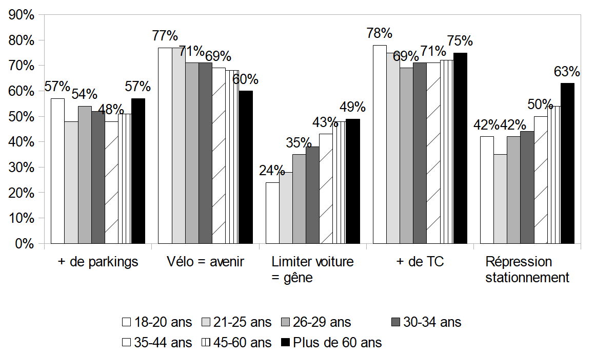 Lecture : sur 100 personnes âgées de 18 à 20 ans, 57 sont d’accord avec l’affirmation « Il faut continuer à construire des parkings ».