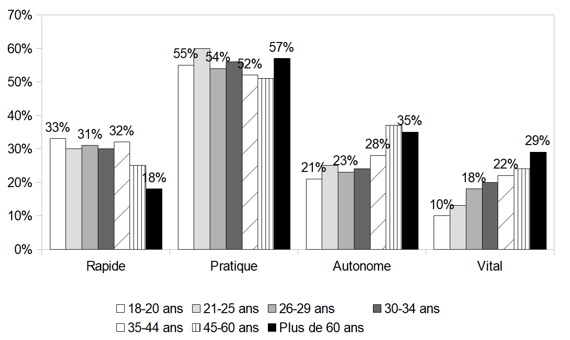 Lecture : sur 100 personnes âgées de 18 à 20 ans, 33 jugent la voiture rapide.
